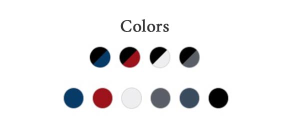 น้ำเงิน, แดง, ขาว, เทา, เทาดำ, ดำ |