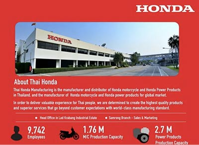 สำหรับบริษัท ไทยฮอนด้า แมนูแฟคเจอริ่ง จำกัด สามารถผลิตรถจักรยานยนต์ปีละ 1.76 ล้านคัน แบ่งเป็นสัดส่วน ในการผลิตเพื่อตลาดในประเทศอยู่ที่ 82% ตลาดต่างประเทศ 18% และสามารถผลิตเครื่องยนต์อเนกประสงค์ได้ปีละ 2.7 ล้านเครื่อง แบ่งเป็นการผลิตเพื่อตลาดในประเทศ 7% และตลาดต่างประเทศอีก 93%