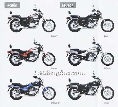 ล้อซี่ลวด : เขียว, น้ำตาล, ดำ / ล้อแม็ก : แดง, เทา, น้ำเงิน |